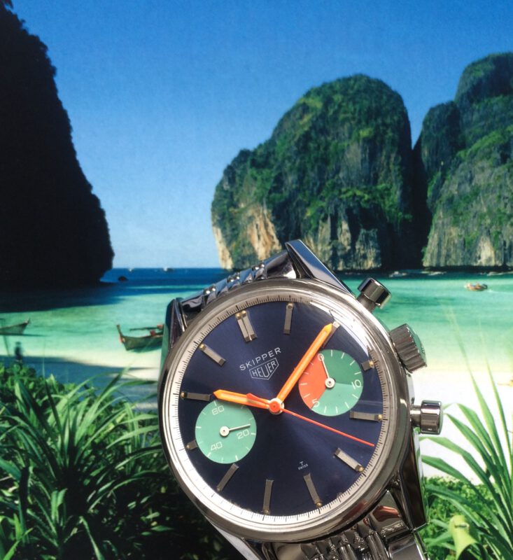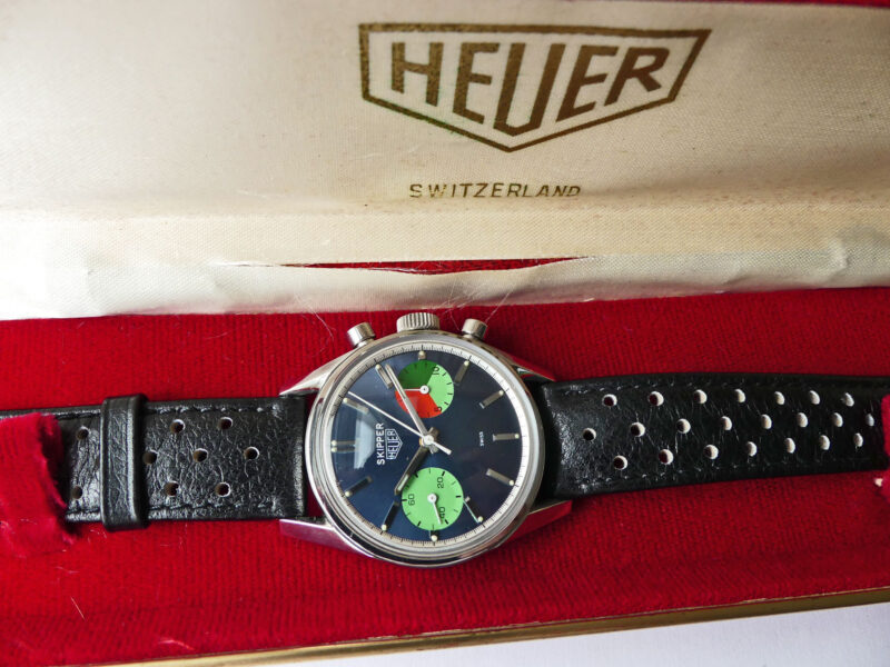 This watch, often referred to as the “Skipperera,” is now considered the rarest and most sought-after of all Skipper models. Less then 20 examples are known to still exist. The nickname “Skipperera” arose because it is the only Skipper model ever produced in an original 36-mm Heuer Carrera case. The development of the watch was personally initiated by Jack Heuer, who commissioned it as a tribute to the America’s Cup victory.