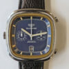 This exceptional Heuer model with a fumé-colored dial was named after the British racetrack “Silverstone.” This watch, in authentically good condition with Ref. 110.313F, was manufactured in 1974, based on the automatic movement Heuer / Buren 12. A typical feature of this movement is the winding crown positioned on the left side. The blue dial version of this watch was worn by Clay Regazzoni, one of the most famous racing drivers of that era. Only three dial colors were released: Bordeaux red, fumé grey, and blue. Comes with a black leather strap and Heuer buckle.