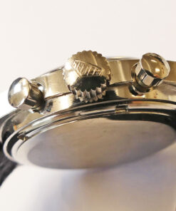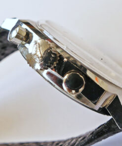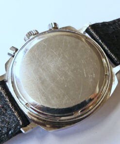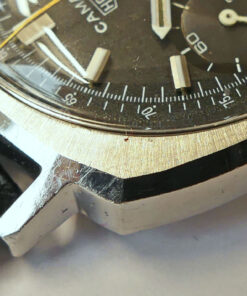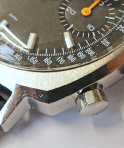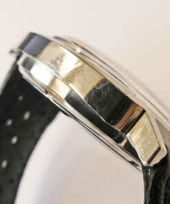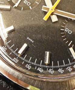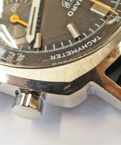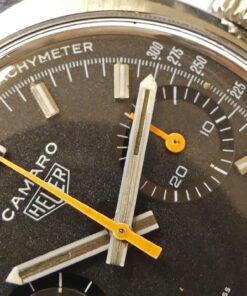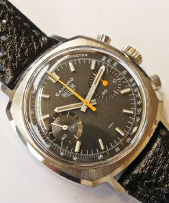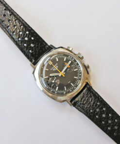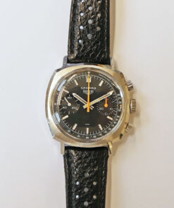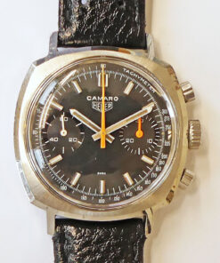 56 Jahre ! Außergewöhnlicher Heuer Camaro Chronograph Ref.73343NT von 1969. Der Handaufzug – Chronograph mit dem bekannten Cal. Valj. 7733 hat ein schwarzes Zifferblatt mit zwei gleichfarbigen Registern. Kontrastreich mit orange farbenen Indexen und Zeigern. Die Uhr ist in einem sehr guten Zustand. Besonderheit: Tachymeterskala auf Zifferblatt. Mit schwarzem Lederband und Heuerschließe.
