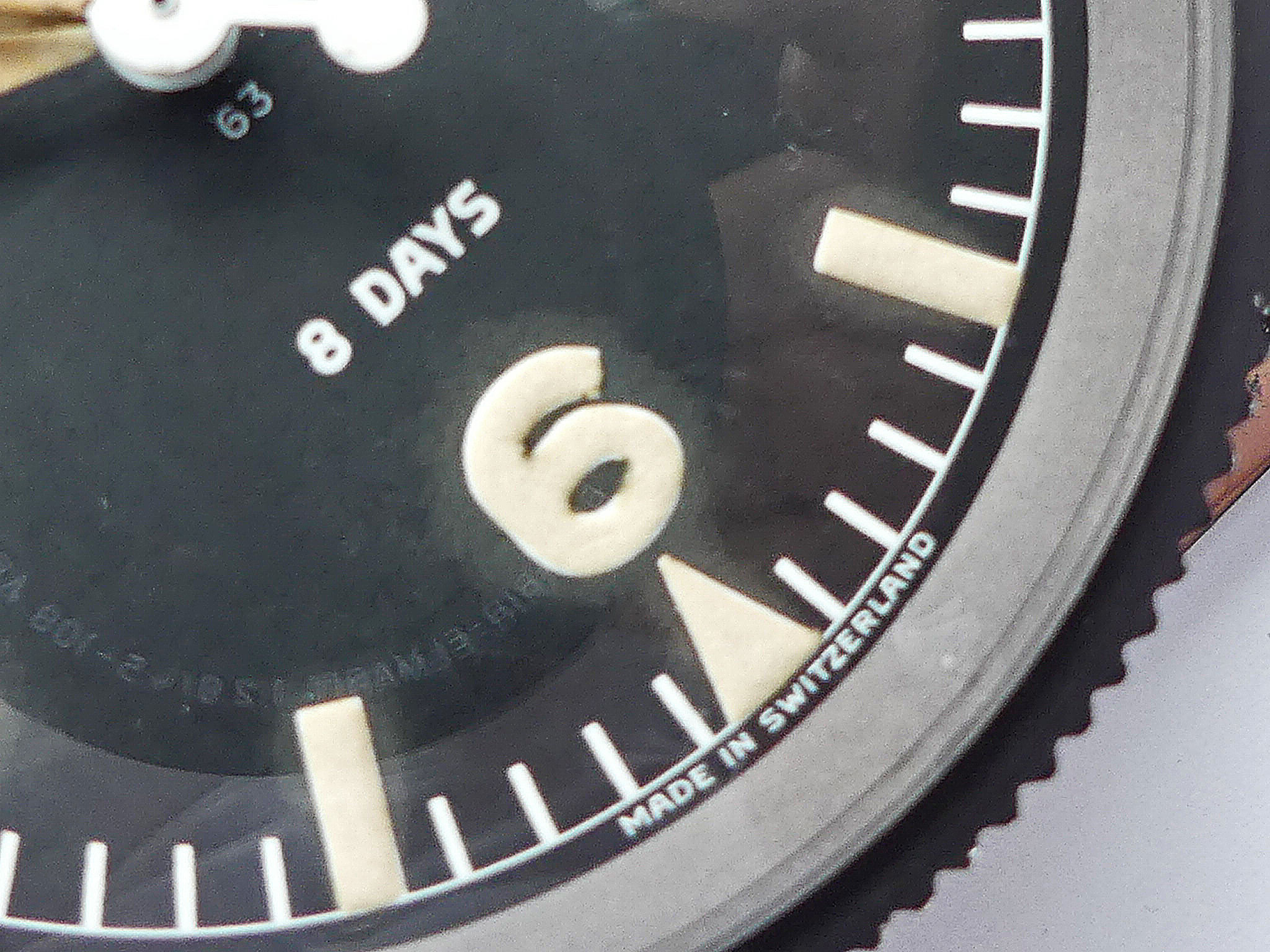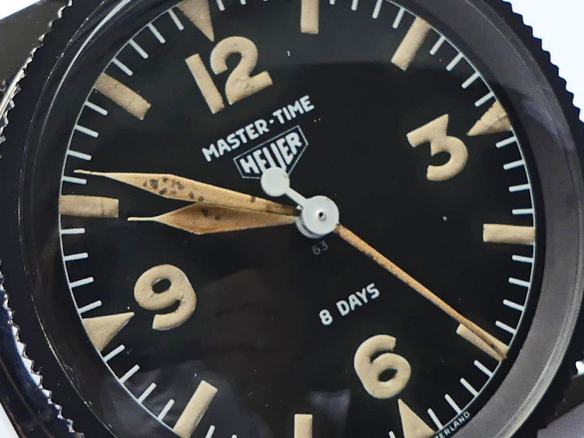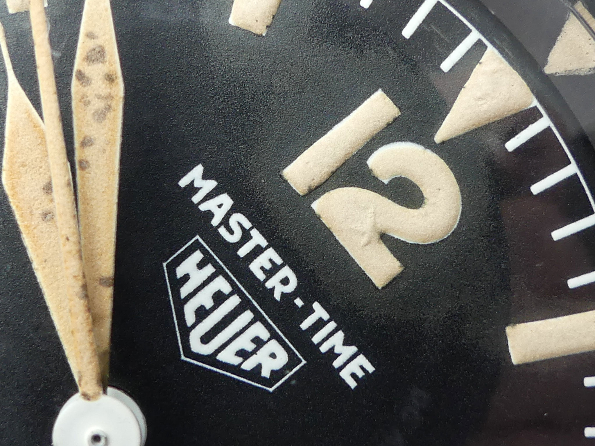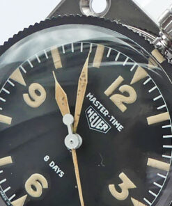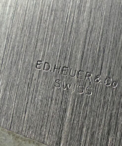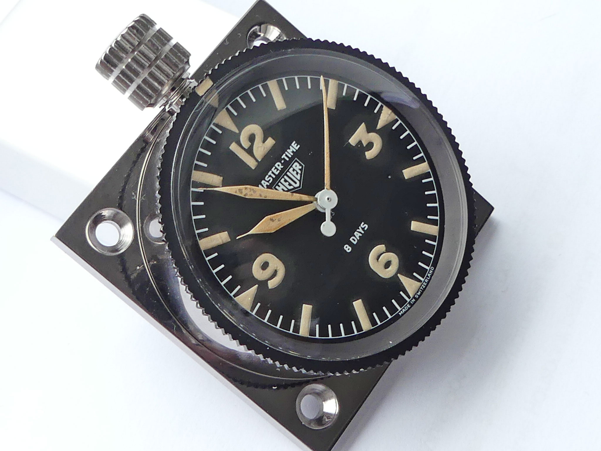 Sehr gut erhaltene Vintage Heuer Mastertime mit 3/6/9/12 Ziffern und Tritiumzifferblatt von 1965. Hervorragender Originalzustand, technisch einwandfrei. Werk Arogno 28H. 8 Tage Präzisionsuhr mit Zentrumssekunde, Ankerwerk, 15 Steine. Drehbarer Glasring mit Markierungsdreieck. Zeigt entweder die genaue Tageszeit oder die gesamte Fahr- oder Flugzeit. Perfekter Rallyetimer aus Mitte der 1960iger Jahre für jede Rallyeprüfung. Montiert auf originaler Heuerplatte – Ed Heuer signiert.