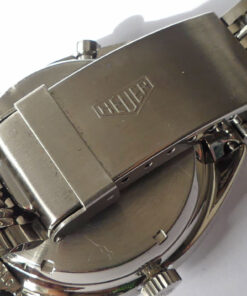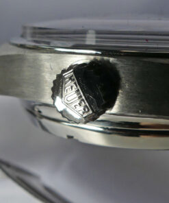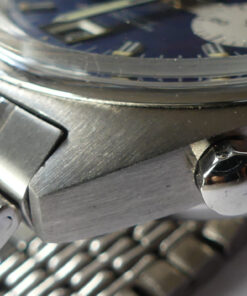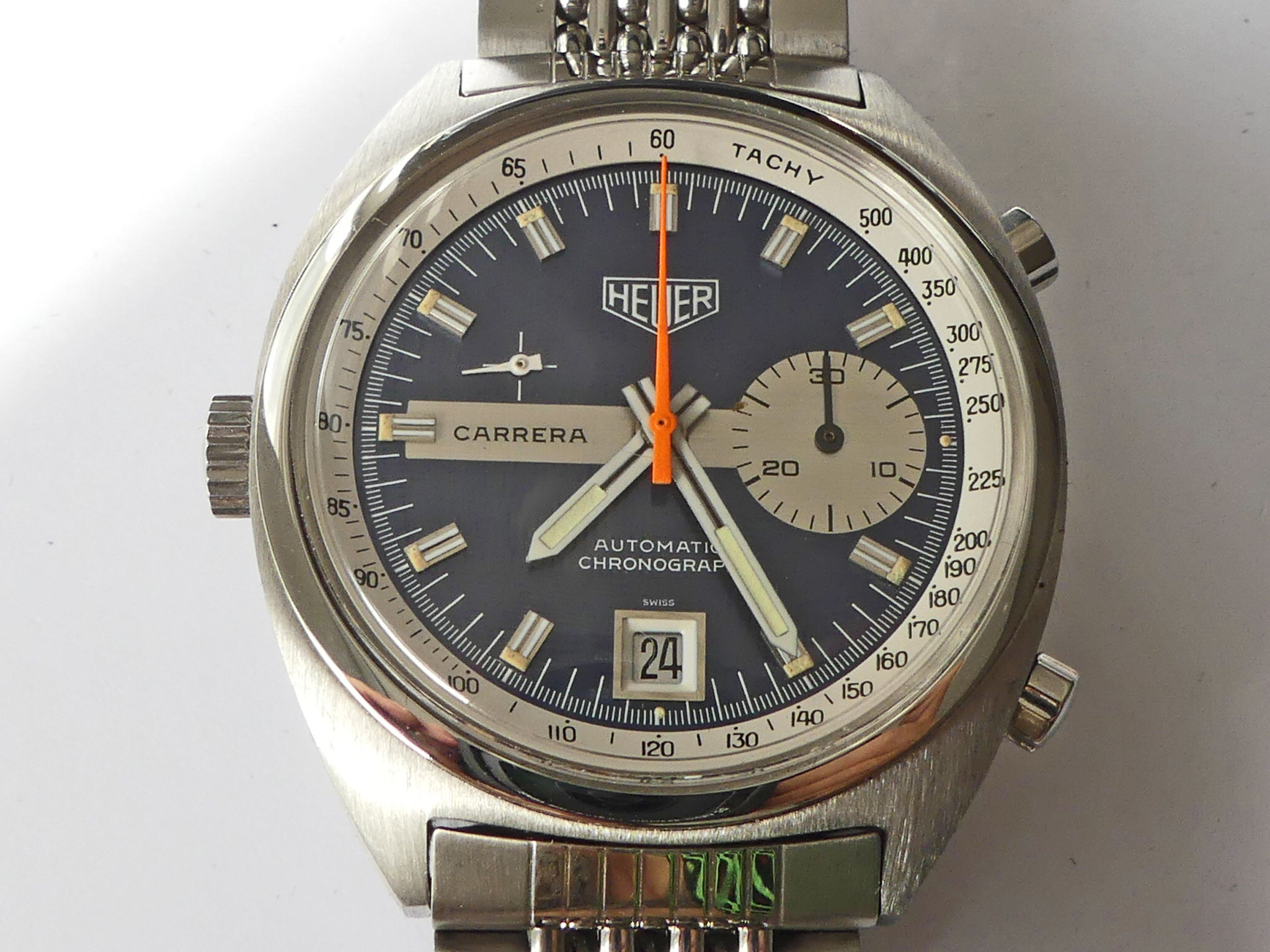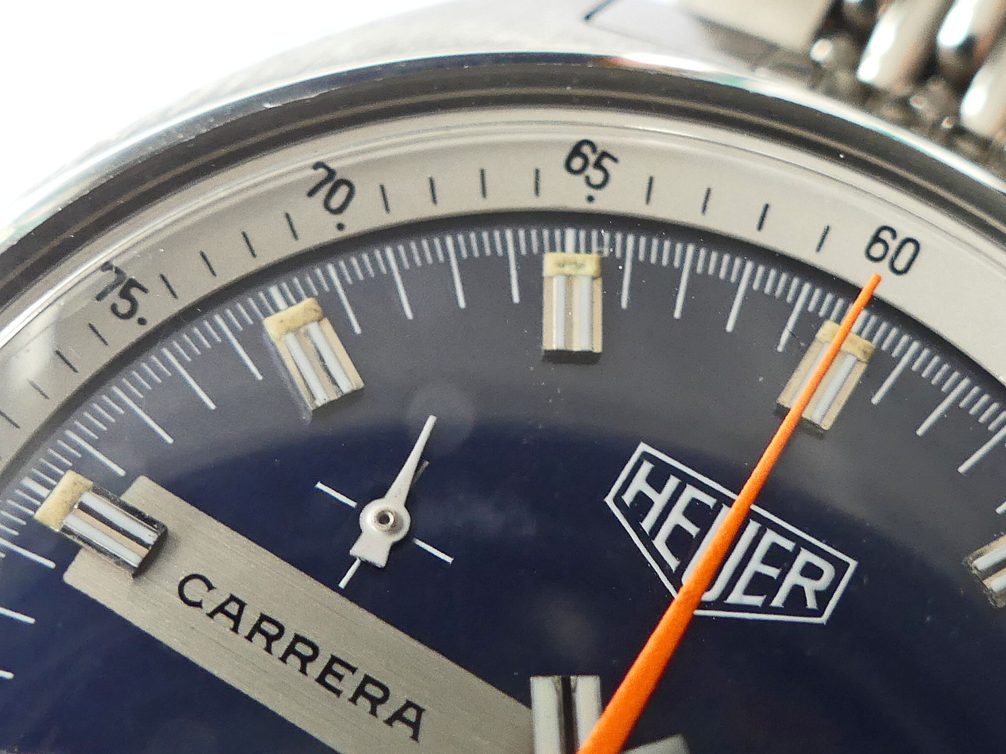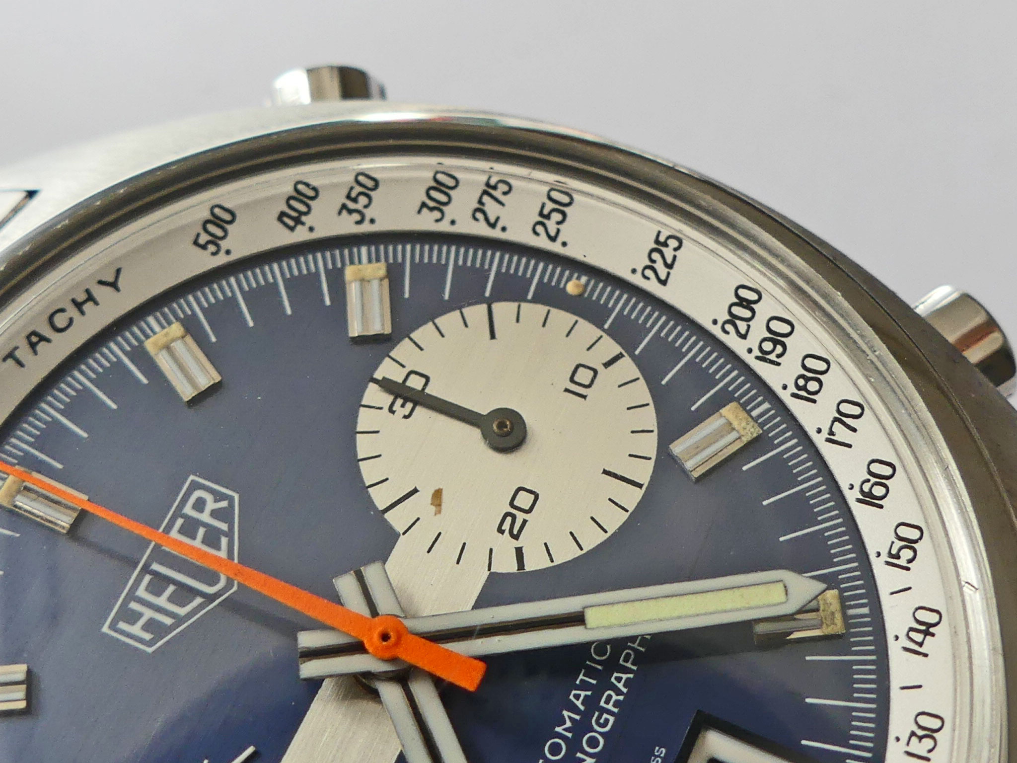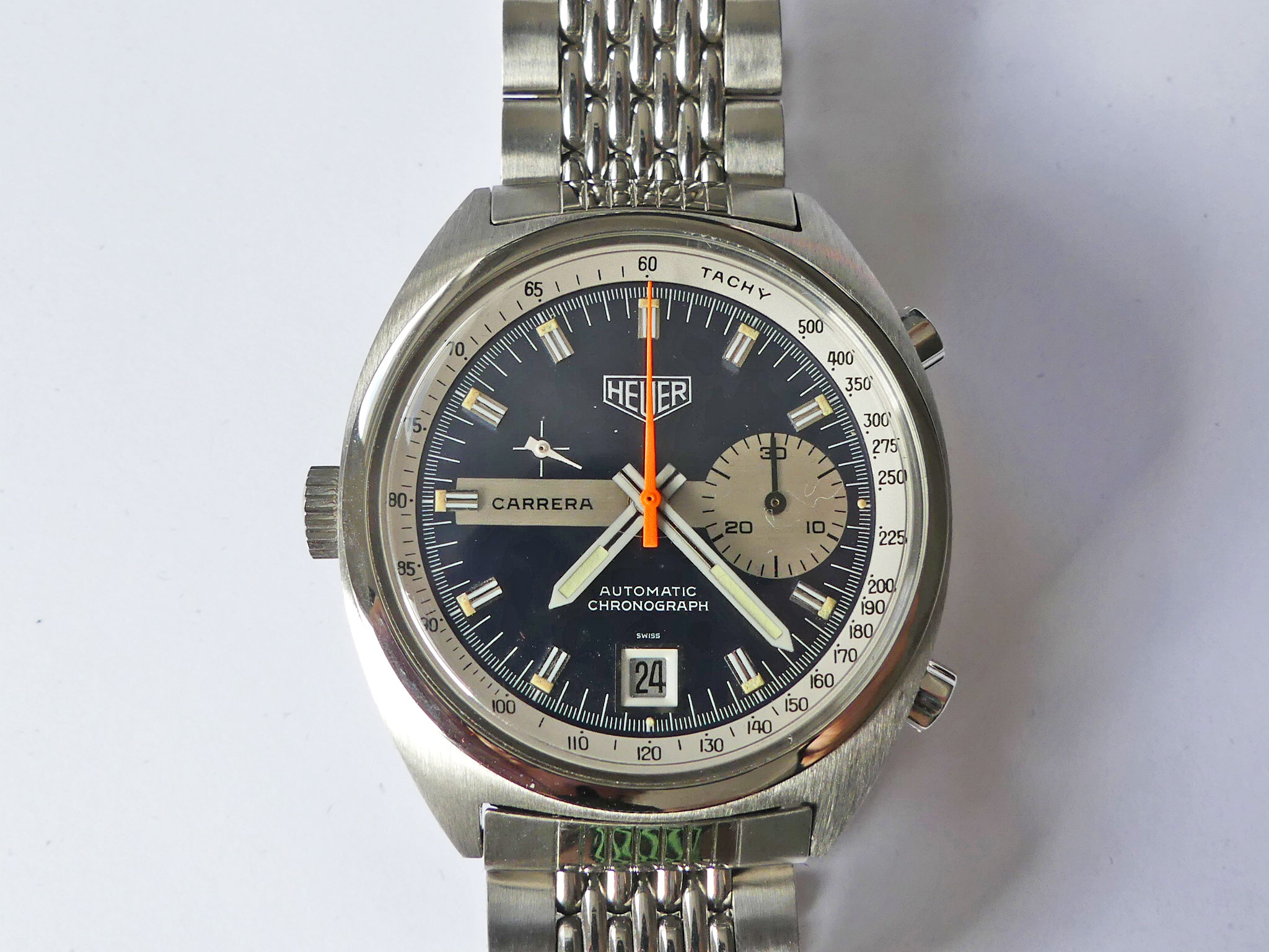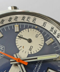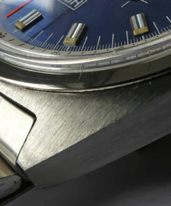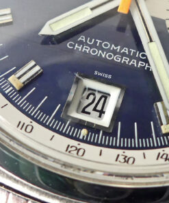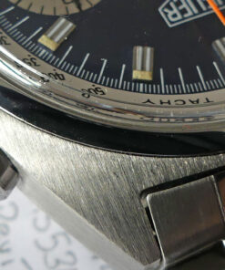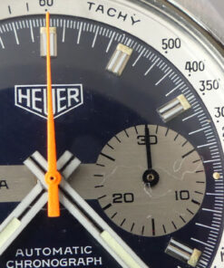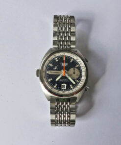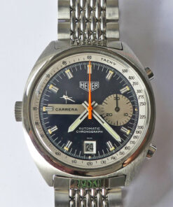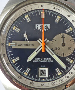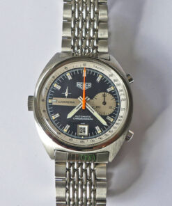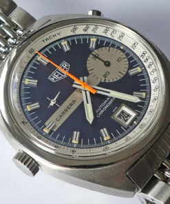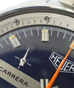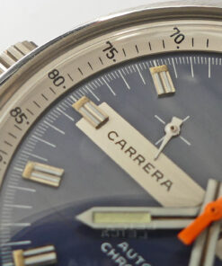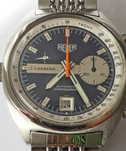 This model is a version from 1972 — a particularly beautiful example in perfect condition with a striking, high-contrast design.The Heuer Carrera Chronograph Ref. 1553N, featuring the automatic Caliber Heuer / Buren 15, has a blue dial with a silver-grey sub-dial for the running seconds at 10 o’clock, and a date display at 6 o’clock.The central chronograph seconds hand is orange, while the tachymeter scale is printed black on white. The case, dial, and hands are in unpolished, authentic condition.NOS (new-old-stock) with original Guy-Frères stainless steel bracelet.
