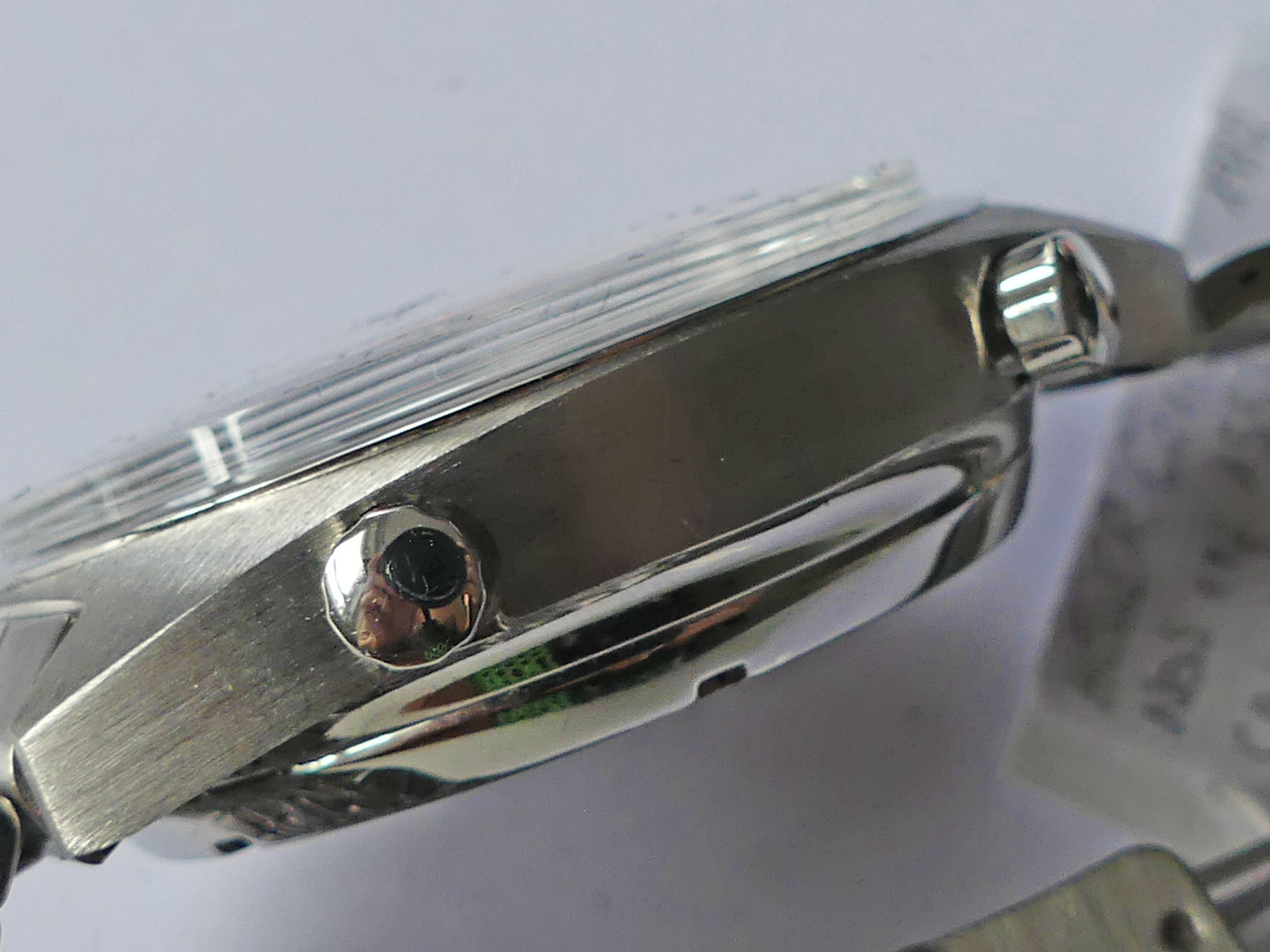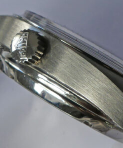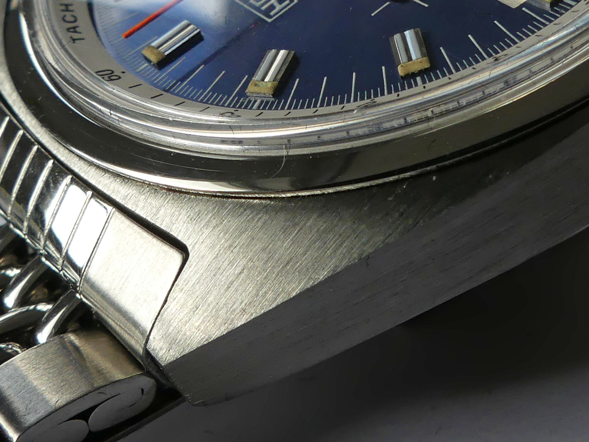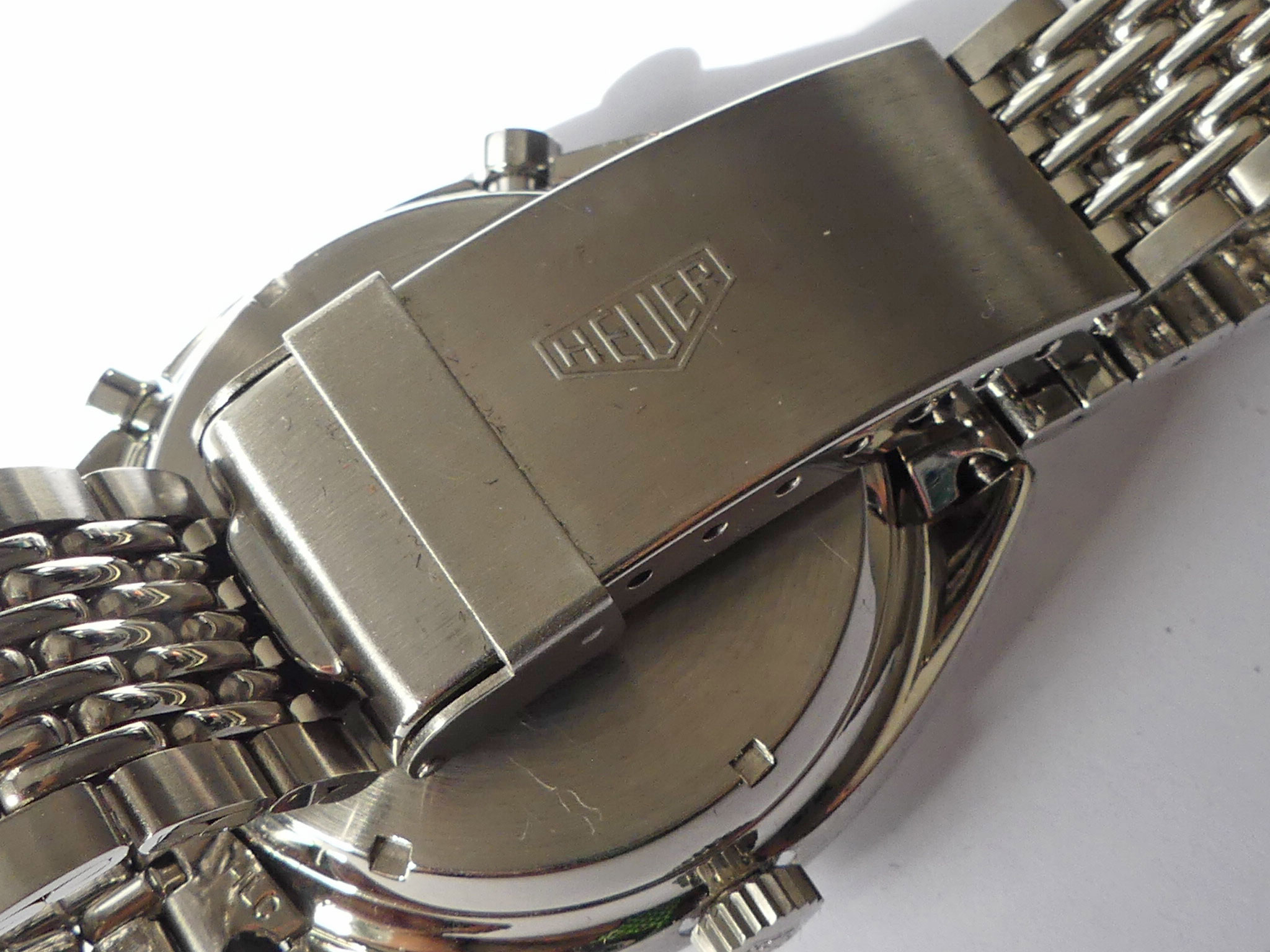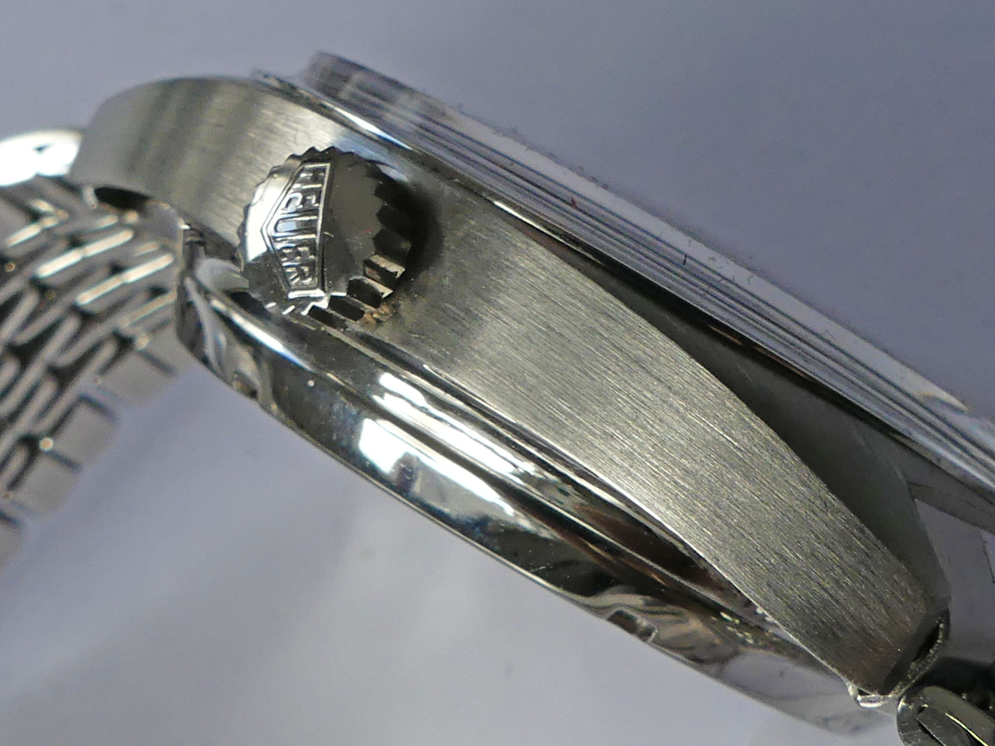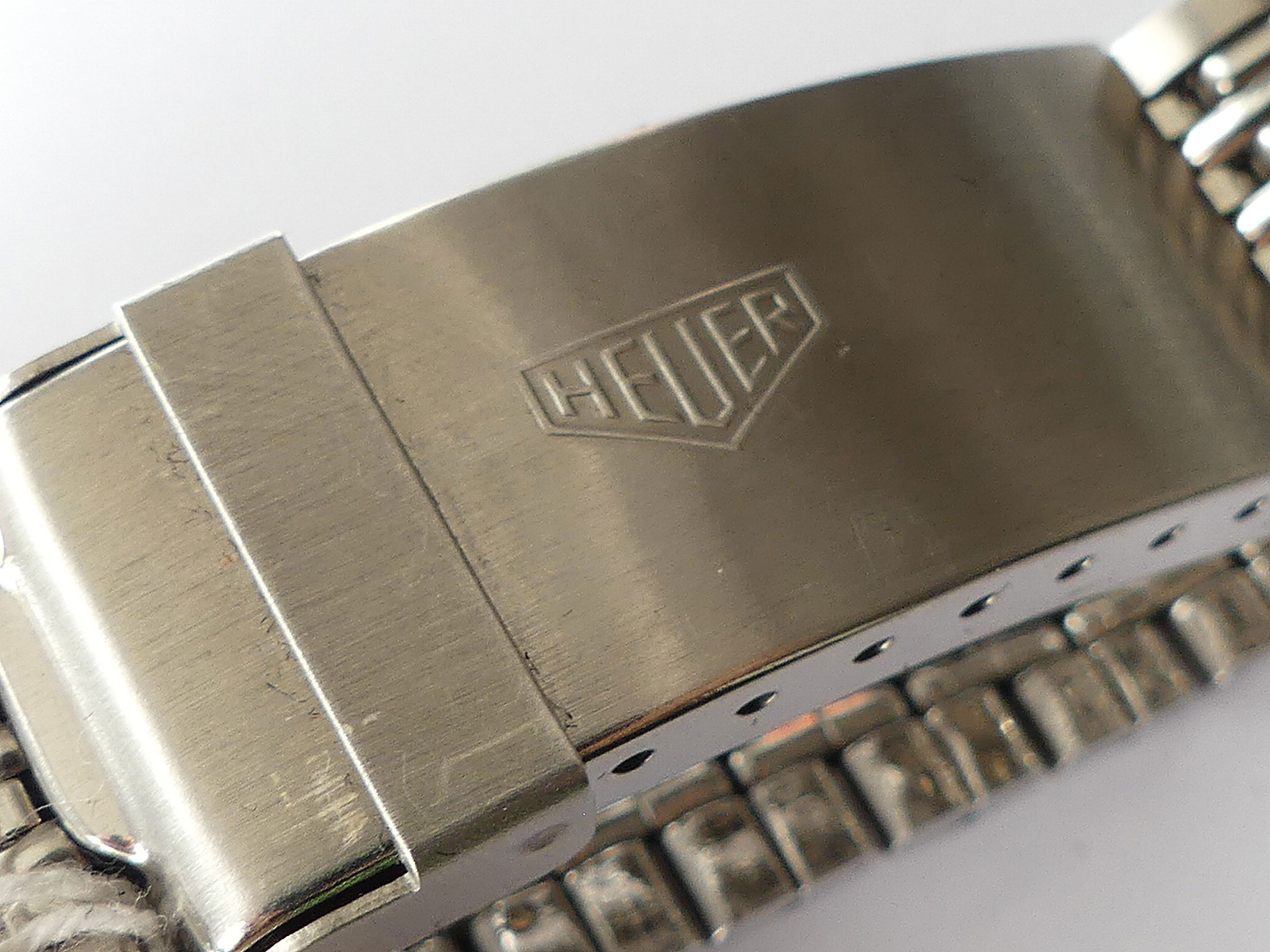 This model is a version from 1972 — a particularly beautiful example in perfect condition with a striking, high-contrast design.The Heuer Carrera Chronograph Ref. 1553N, featuring the automatic Caliber Heuer / Buren 15, has a blue dial with a silver-grey sub-dial for the running seconds at 10 o’clock, and a date display at 6 o’clock.The central chronograph seconds hand is orange, while the tachymeter scale is printed black on white. The case, dial, and hands are in unpolished, authentic condition.NOS (new-old-stock) with original Guy-Frères stainless steel bracelet.